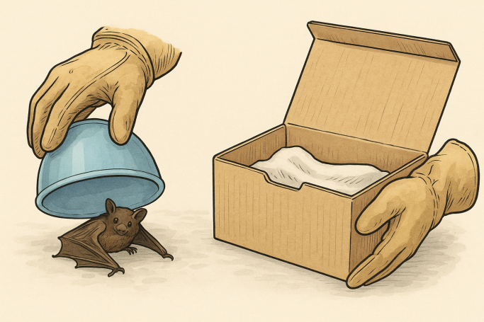 - Fledermaus vorsichtig mit einer Dose, Becher, Tuch vorsichtig in einen kleinen Karton (Teeschachtel)schieben, gut verschließen da Ausbruchskünstler und wärmen.